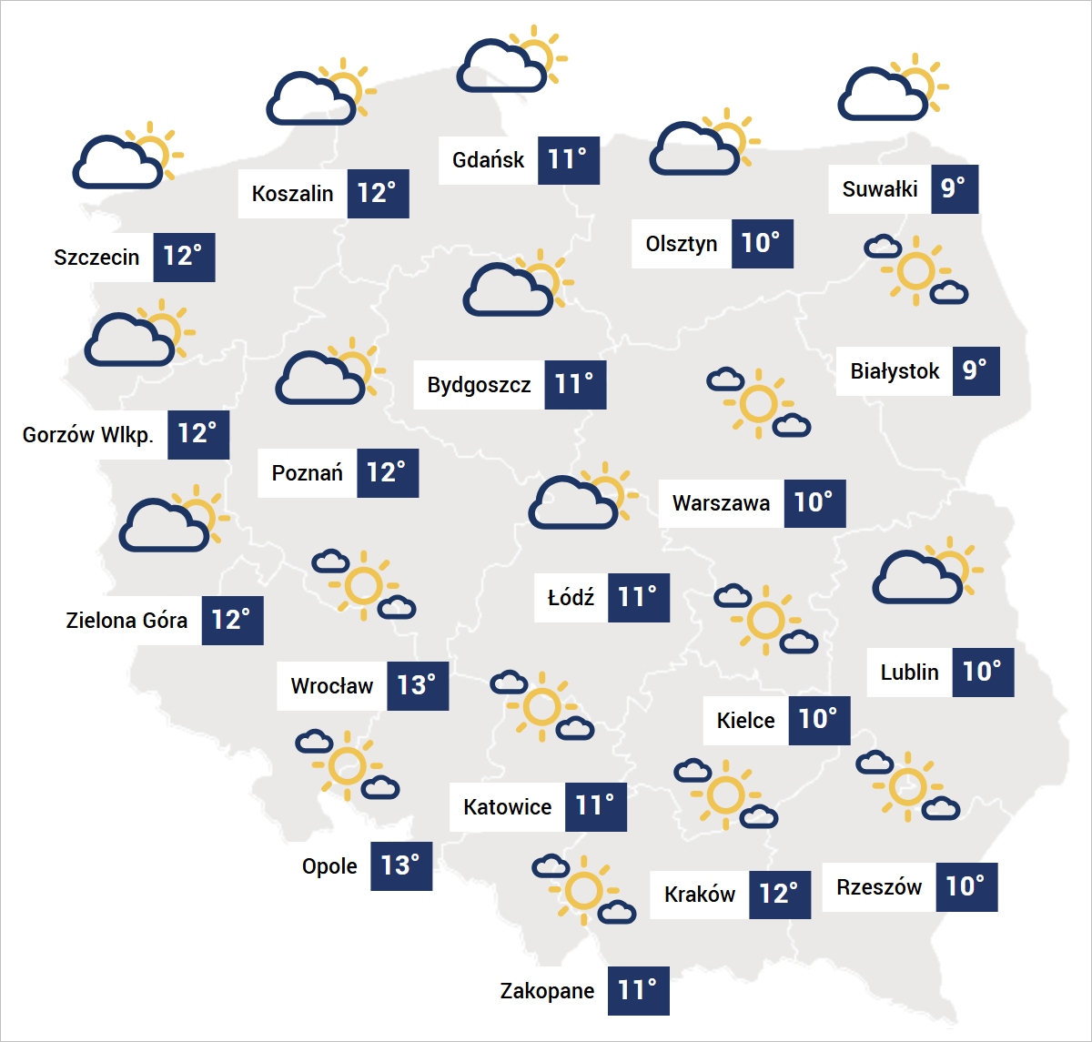 Prognoza pogody na 13 listopada.Wraz z rozpogodzeniami zacznie napływać cieplejsze powietrze z południa, które podniesie temperaturę z codziennych zaledwie 8-10 stopni do przeważnie 12-15 stopni. Najcieplej będzie na zachodzie i południu, gdzie termometry pokażą podczas wiatru fenowego nawet do 20 stopni.