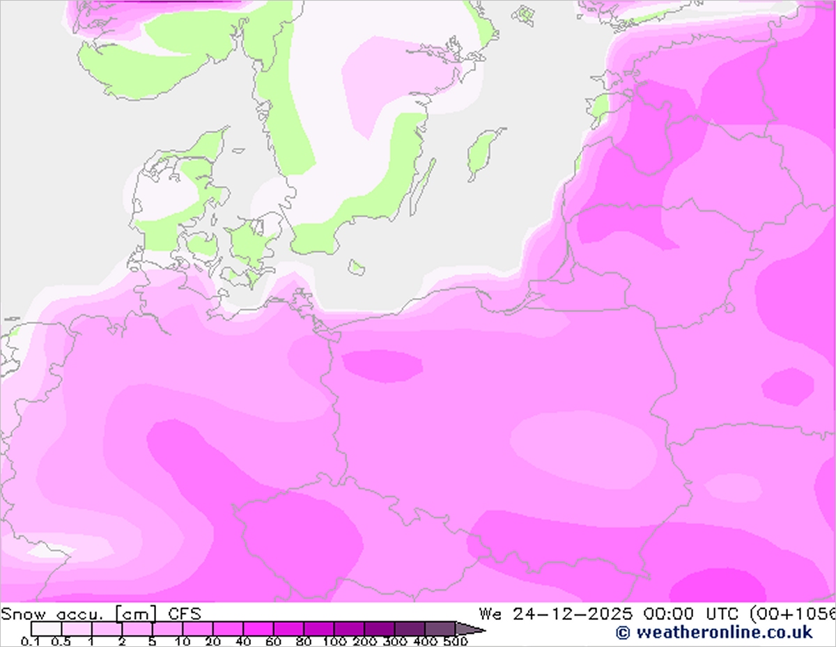 Tyle śniegu może leżeć w Wigilię. Fot. weatheronline.co.ukChociaż w międzyczasie temperatury będą się wahać między minusami a plusami, to jednak spadnie na tyle dużo śniegu, aby nie zdołał się on całkowicie roztopić, w dodatku nadal będzie go przybywać. W najzimniejsze noce będzie nawet kilkanaście stopni mrozu.
