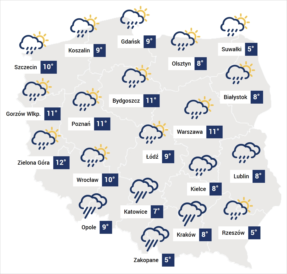 Chociaż możemy liczyć na większe przejaśnienia i rozpogodzenia, to jednak przeważać będą deszcze połączone z porywistym wiatrem, szczególnie silnym na terenach górzystych i okołogórskich. Nie można wykluczyć wichury, bo wahania ciśnienia będą bardzo duże.