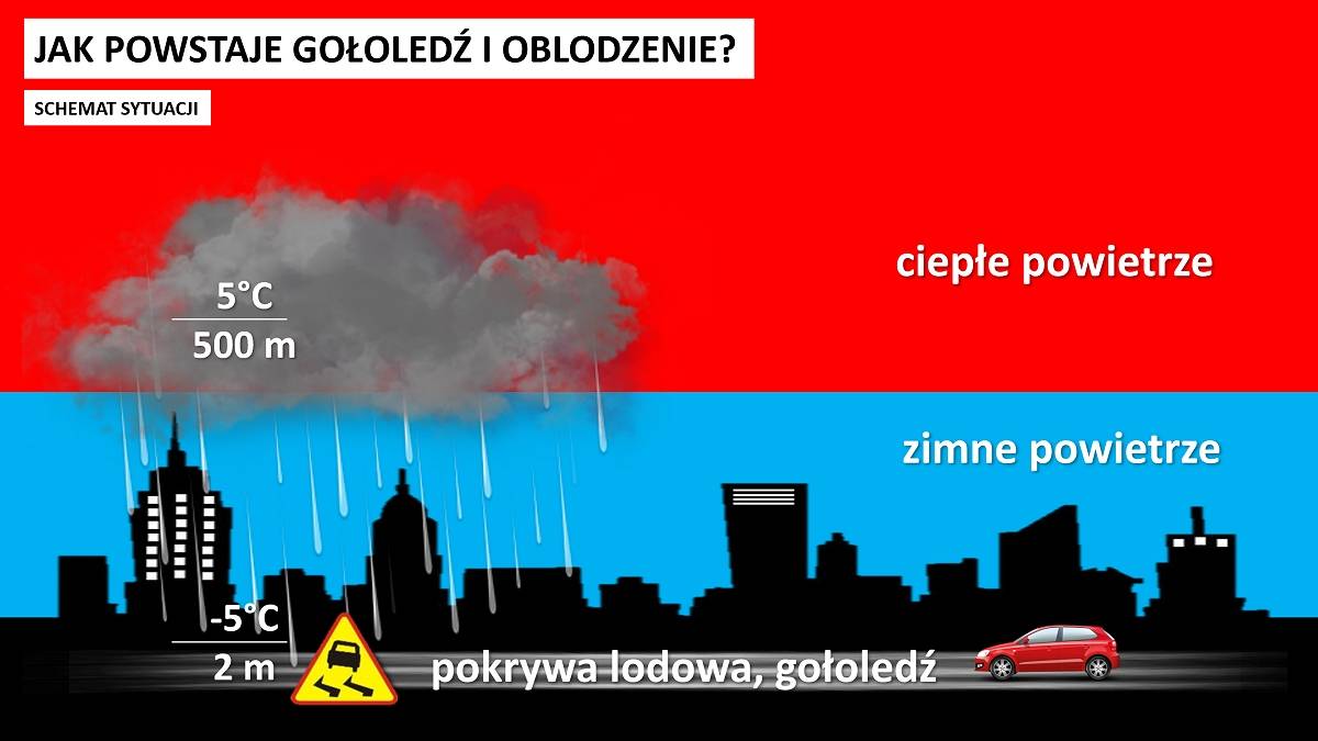 Zamiast śniegu zacznie padać deszcz, który dotykając wychłodzonej ziemi zacznie zamarzać tworząc niebezpieczne oblodzenie. Drogi i chodniki mogą być śliskie. Szczególnie trudna sytuacja będzie miała miejsce od piątkowego (28.11) wieczora na zachodzie i północnym zachodzie kraju.