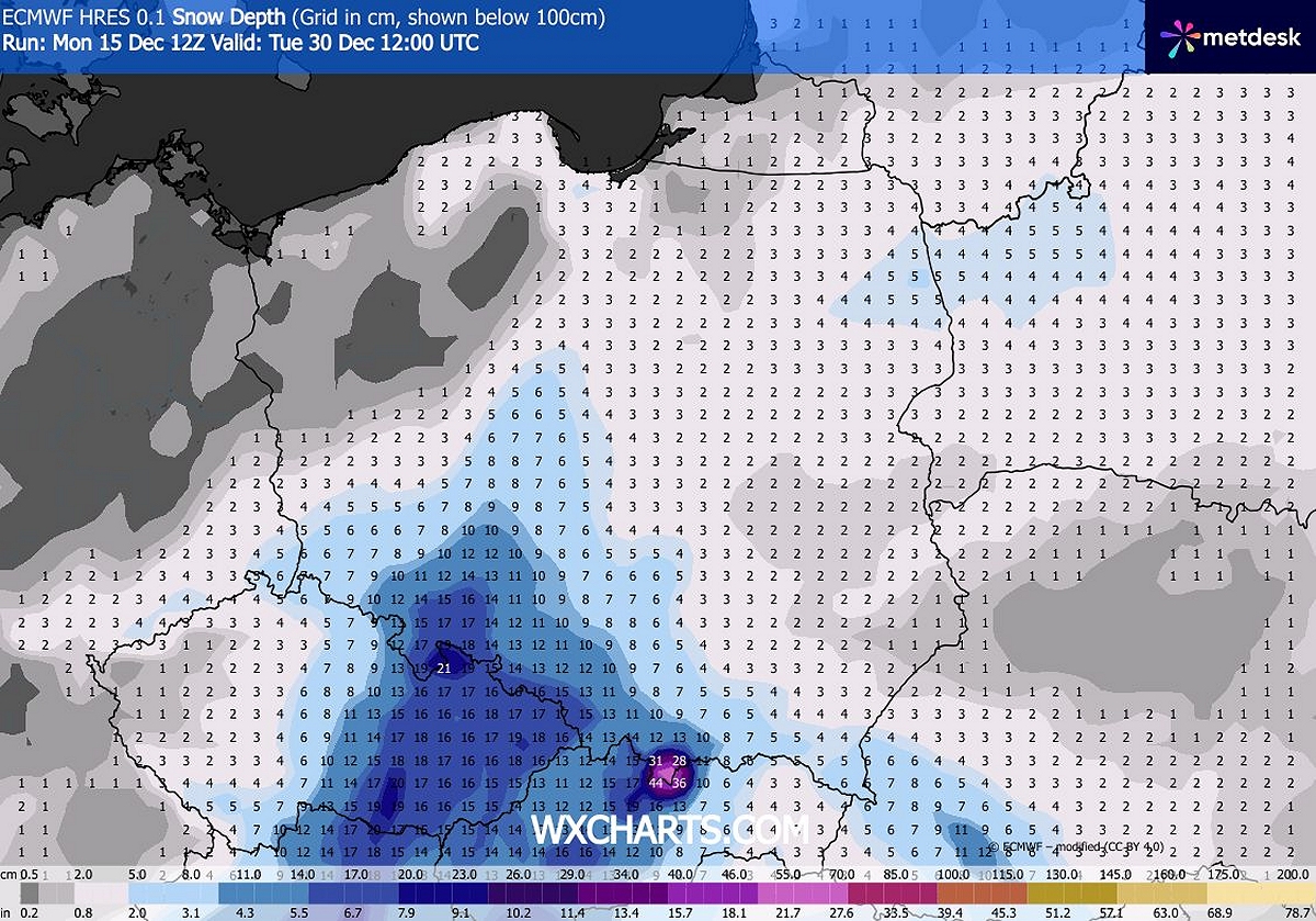 Prognoza pokrywy śnieżnej według modelu ECMWF w dniu 30 grudnia. Fot. wxcharts.comTo oznacza, że arktyczne powietrze zacznie spływać w naszym kierunku szerokim strumieniem. Początek odwrócenia się pogody wskazywany jest przez modele między 24 a 28 grudnia. To oznacza, że podczas świąt krajobrazy w niektórych regionach kraju, początkowo lokalnie, zaczną się zabielać.