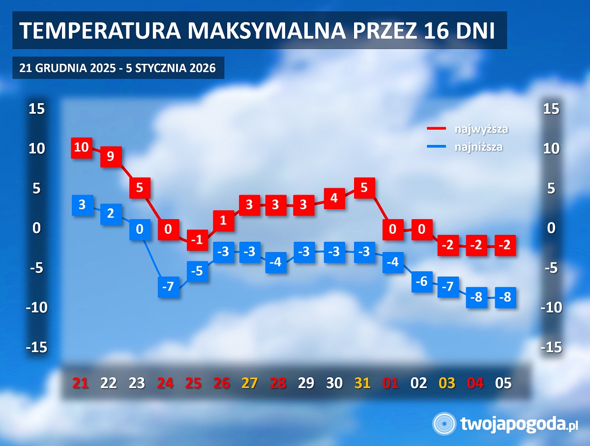 Zmiany rozpoczną się w święta, gdy znad Arktyki zacznie spływać mroźne powietrze przynosząc w większości regionów całodobowy mróz. Za dnia będzie niewielki, jednak nocami i o porankach trzeba się liczyć ze spadkami temperatury do -10 stopni, a miejscami nawet do -15 stopni.