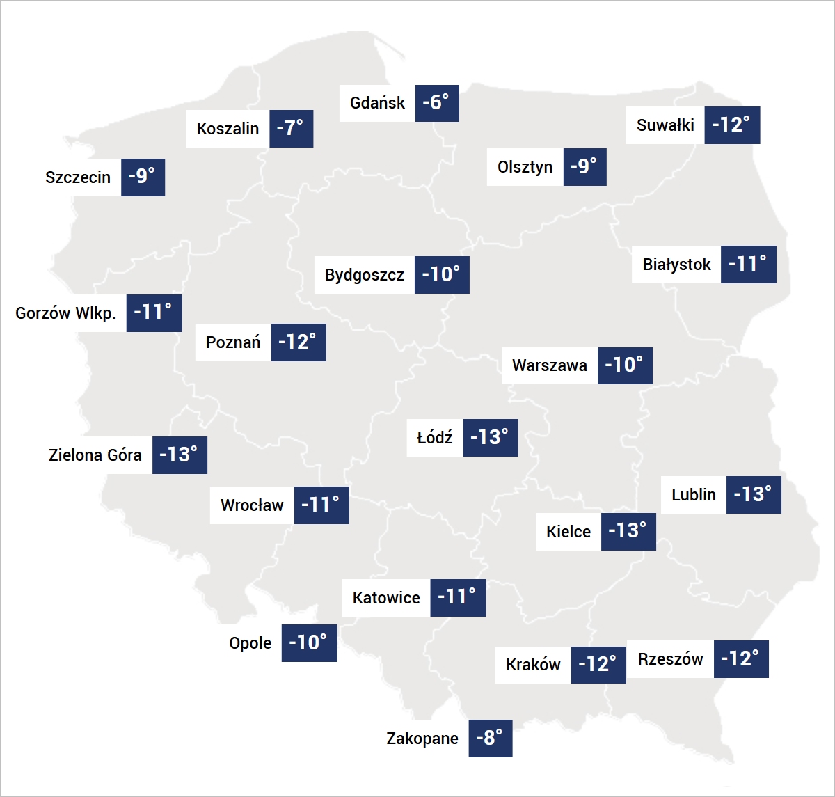 Temperatura odczuwalna w wigilijną noc.Obecnie biegunem zimna jest Jakucja, gdzie termometry o wczesnych porankach pokazują nawet minus 57 stopni. Tak lodowato jest m.in. w miejscowości Delankir w ułusie ojmiakońskim, który jest najmroźniejszym stale zamieszkanym miejscem na Ziemi.
