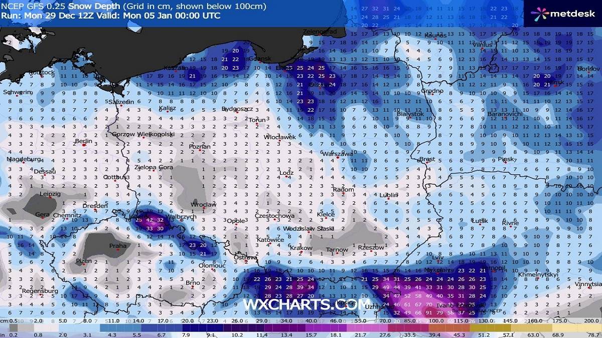 Tyle śniegu (cm) może leżeć do końca tygodnia. Fot. wxcharts.comNajbliższe noce i wczesne poranki będą też mroźne. Szczególnie lodowato zapowiada się noc z Sylwestra na Nowy Rok. Temperatura będzie spadać przeważnie do -5/-10 stopni, a na wschodzie do -10/-15 stopni. W drugiej połowie tygodnia mróz zelżeje, ale na krótko.