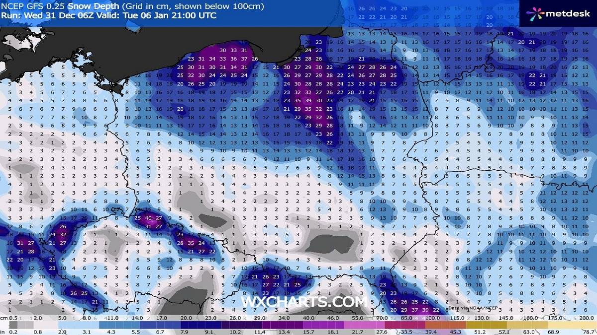 Szczególnie mocno i długotrwale sypać będzie w nadchodzących dniach na Pomorzu, Warmii, Mazurach, Suwalszczyźnie, Podlasiu i Mazowszu. Tylko od piątku do niedzieli (2-4.01) spadnie tam 20-30 centymetrów świeżego puchu, a lokalnie nawet do 50 centymetrów.
