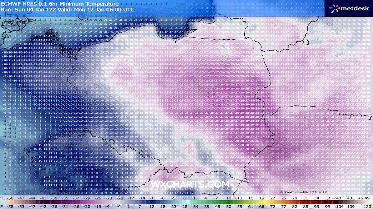 Temperatury minimalne 12 stycznia nad ranem. Fot. wxcharts.comW górskich kotlinach i kotłach polodowcowych mróz może się okazać ekstremalny. Niewykluczone, że temperatura spadnie do około -40 stopni, jak miało to miejsce 17 lutego 2025 roku w Litworowym Kotle w Tatrach oraz 8 stycznia 2017 roku w Czarnym Dunajcu na Podhalu.