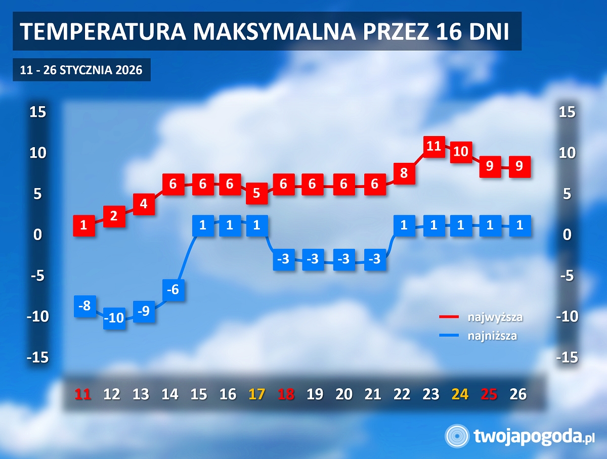 Temperatury początkowo sięgać będą od 1 do 5 stopni, zarówno za dnia, jak i w nocy. Od początku ostatniej dekady stycznia ociepli się jeszcze bardziej, powyżej 10 stopni. W południowych województwach podczas wiatru fenowego nie można wykluczyć nawet 15 stopni.