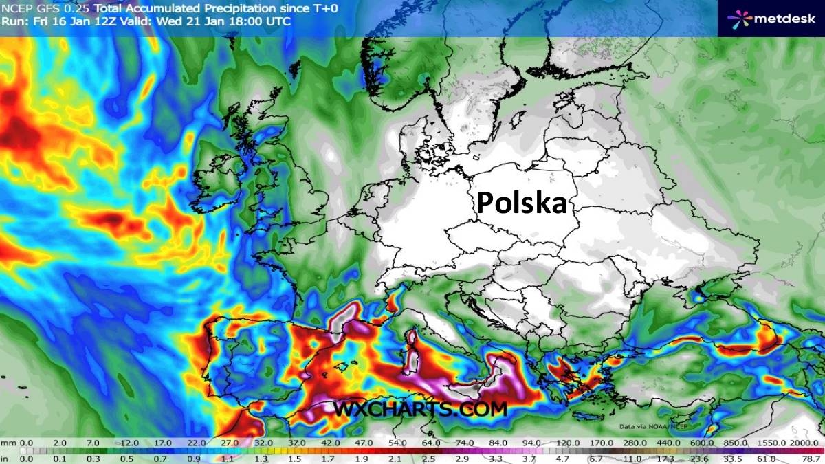 Sumy opadów prognozowane do 21 stycznia. Fot. wxcharts.comProblem stanowi także obecna odwilż na zachodzie i południu kraju, ponieważ powoduje szybkie roztapianie się pokrywy śnieżnej. Woda, która mogłaby zasilić glebę i ją nawodnić, spływa do cieków wodnych i ucieka do Bałtyku.