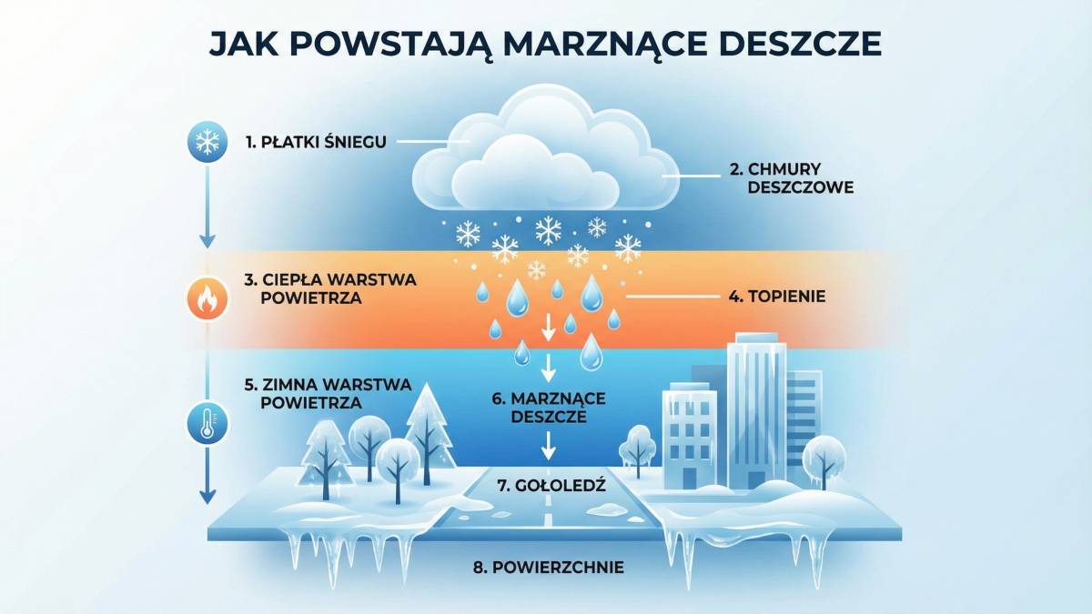 Nie dość, że śnieg sypać może intensywnie, to jeszcze opadać będzie na zamarzające drogi i chodniki, na których zalegać będzie wcześniej spadła deszczówka. Śnieg zamaskuje warstwę lodu, będzie tym samym bardzo ślisko i niebezpiecznie.
