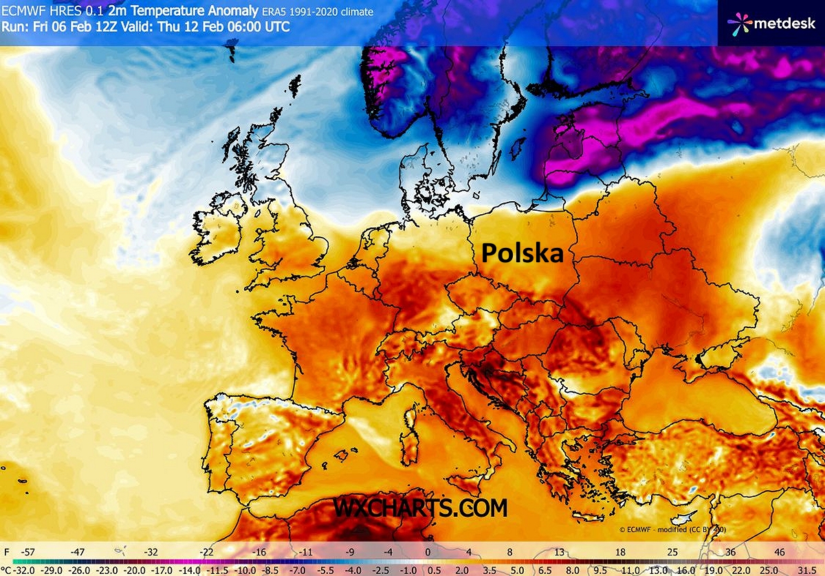 Anomalie temperatury 12 lutego. Czerwony/bordowy - powyżej normy, niebieski/fioletowy - poniżej normy. Fot. wxcharts.comZ każdym dniem będzie coraz cieplej. W czwartek i piątek (12-13.02) termometry pokażą przeważnie od 1 do 5 stopni, jednak na zachodzie, południu i w centrum będzie od 5 do 10 stopni, a lokalnie na Śląsku i w Małopolsce nawet powyżej 10 stopni. Ruszą ogólnokrajowe roztopy.