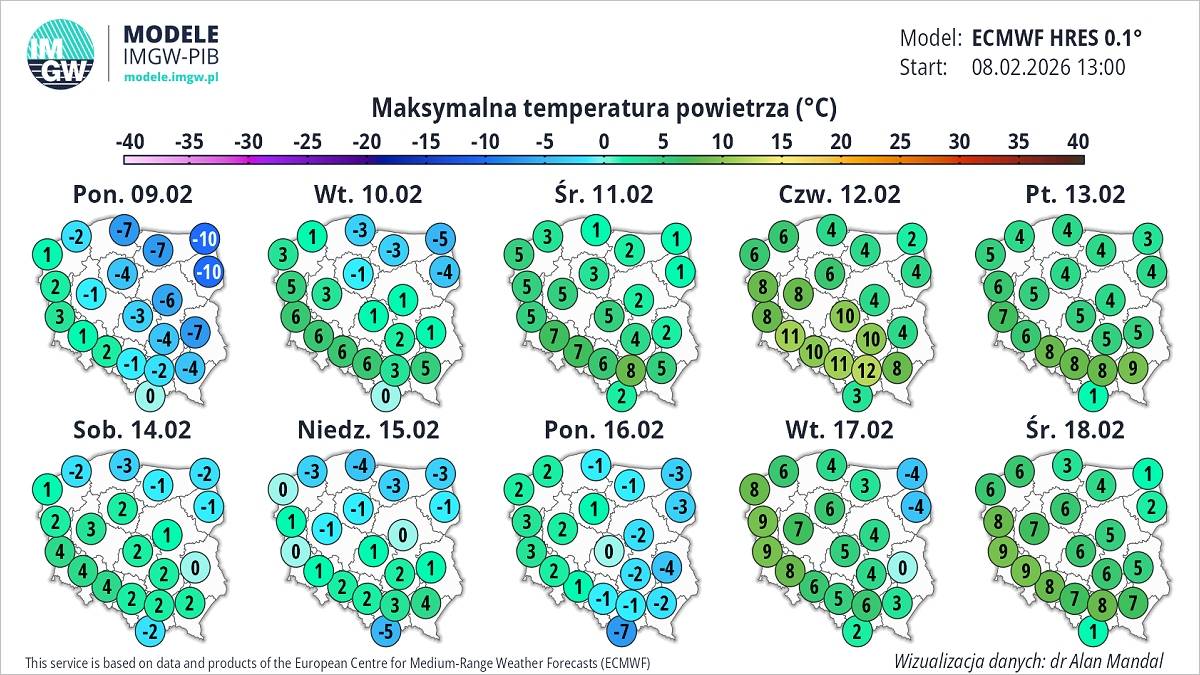 Maksymalne temperatury od 9 do 18 lutego. Fot. IMGW-PIB.Odwilż będzie na tyle trwała i silna, że mrozu na większym obszarze kraju nie spodziewamy się nawet w nocy i o poranku, gdy zwykle jest najzimniej. Ruszą roztopy, a wraz z nimi utrzymujący się śnieg i oblodzenie zaczną znikać.