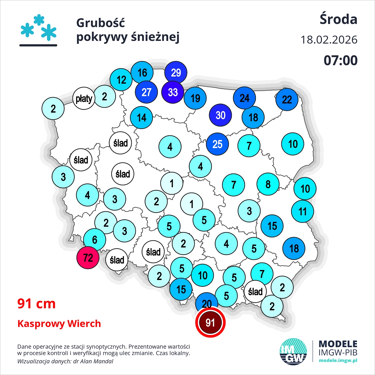 Aktualna grubość pokrywy śnieżnej. Fot. IMGW-PIB.Na przeciwnym biegunie znajduje się Poznań, Gorzów Wielkopolski i Opole, gdzie śnieg występuje jedynie w śladowych ilościach, głównie na obszarach zielonych. Z kolei w górach śniegu nadal jest bardzo dużo, ale mimo to znacznie mniej niż w poprzednich sezonach zimowych.