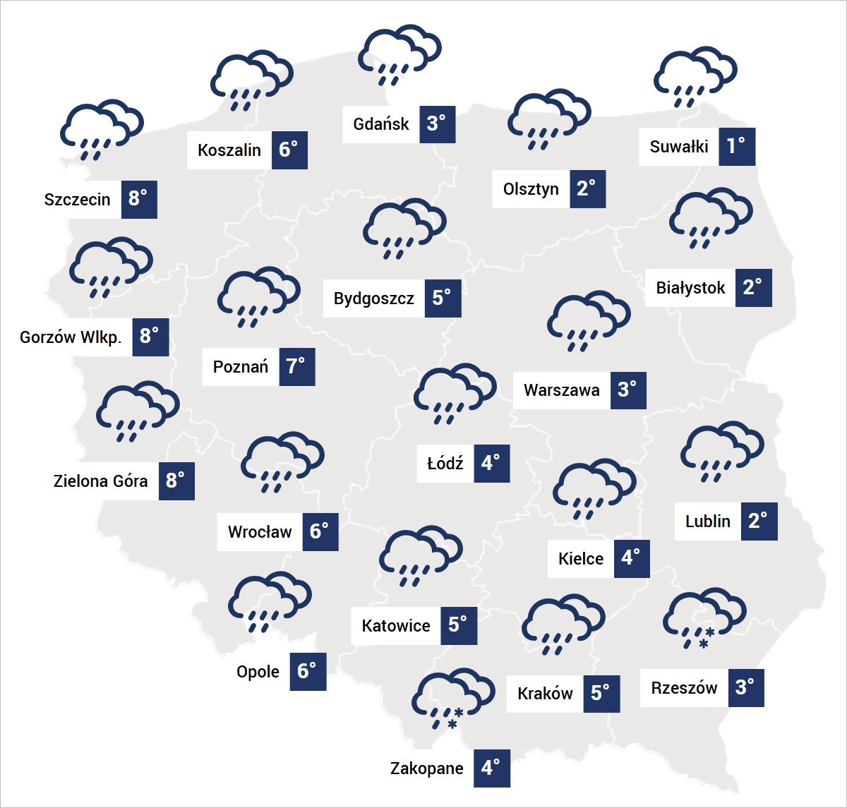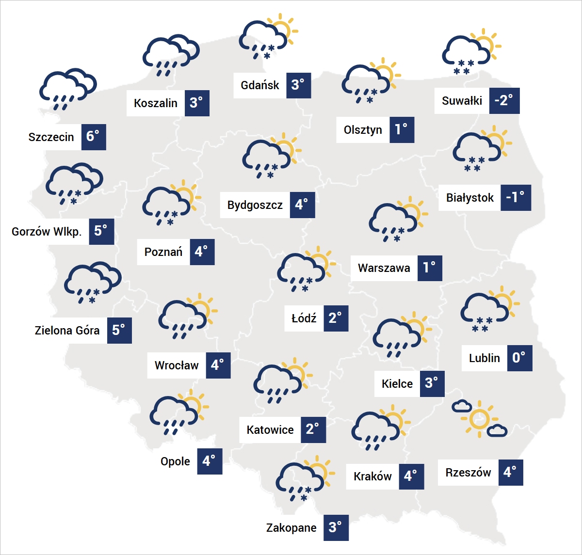 W godzinach popołudniowych i wieczornych śnieżyce przechodzące w deszcz ze śniegiem i ostatecznie w marznący deszcz dotrą nad południowe i wschodnie województwa. Może spaść cienka warstwa puchu, który jednak szybko zacznie się roztapiać wraz ze wzrostem temperatury.