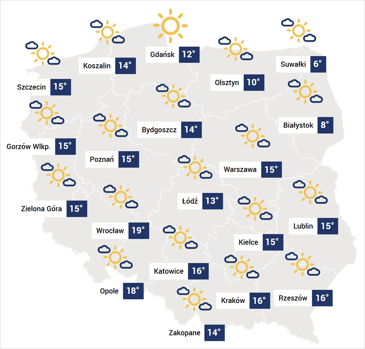 W całej południowej, wschodniej i centralnej Polsce będzie słonecznie i sucho. Zmiany na niebie zaobserwują zaś mieszkańcy zachodnich i północnych regionów, gdzie zacznie się chmurzyć i padać deszcz. Wiatr na ogół będzie słaby, najwyżej umiarkowany, jedynie w górach porywisty.