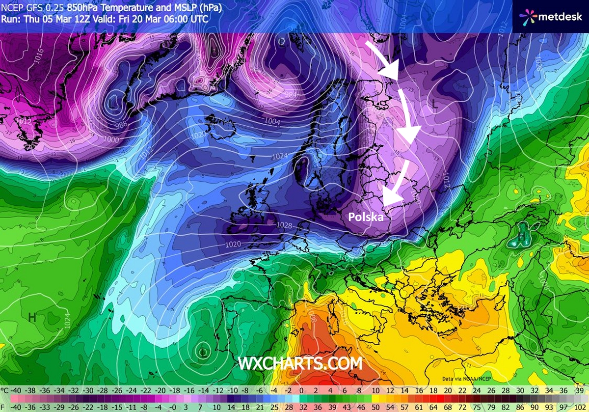 To będzie skutek meandrowania prądu strumieniowego znacznie dalej na południe niż zwykle. Oznacza to najczęściej spływy mroźnego, arktycznego powietrza połączone z opadami śniegu, które miejscami mogą być intensywne, ponieważ w marcu powietrze jest już znacznie bardziej wilgotne niż w styczniu.