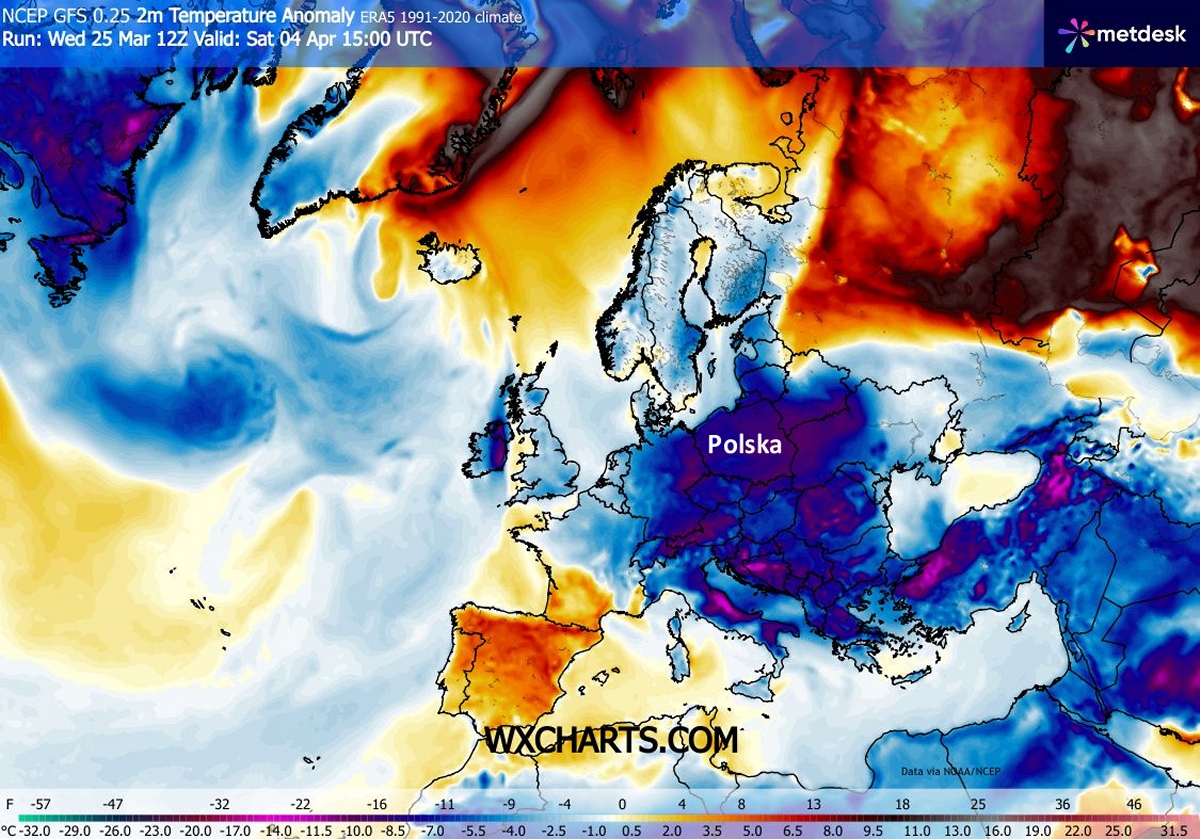 Na mapie anomalii temperatury powietrza Polska będzie się mienić kolorem niebieskim, granatowym, a nawet fioletowym, które oznaczają, że będzie znacznie zimniej niż zwykle na przełomie marca i kwietnia. Średnie temperatury mogą być niższe od normy nawet o kilkanaście stopni.