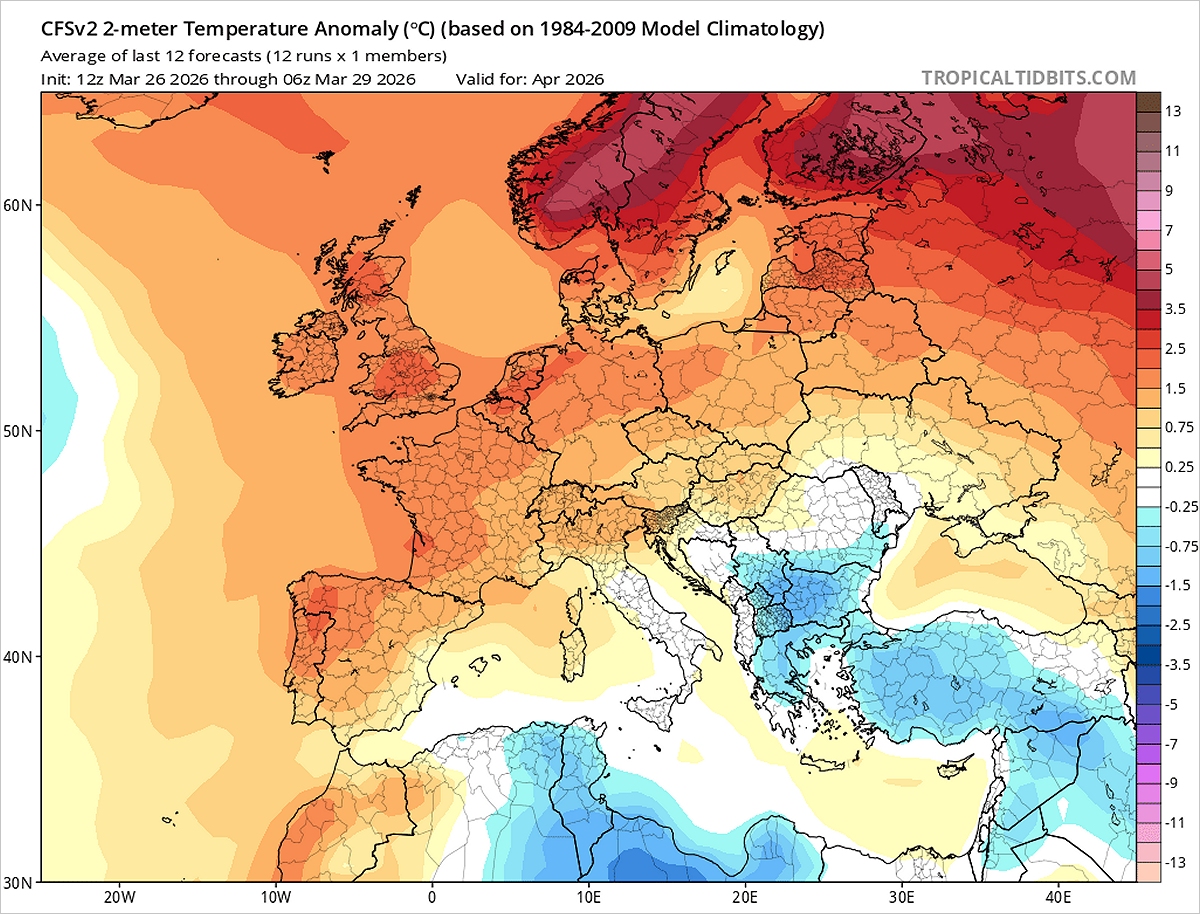 Kwiecień zapowiada się bardzo ciepło. Fot. tropicaltidbits.comŚrednie temperatury będą o 1-2 stopnie wyższe od normy wieloletniej, a na zachodzie i północy kraju nawet do niemal 3 stopni. W przełożeniu na temperatury maksymalne, notowane popołudniami, oznacza to przeważnie od 12 do 18 stopni, a w najcieplejsze dni nawet powyżej 20 stopni.
