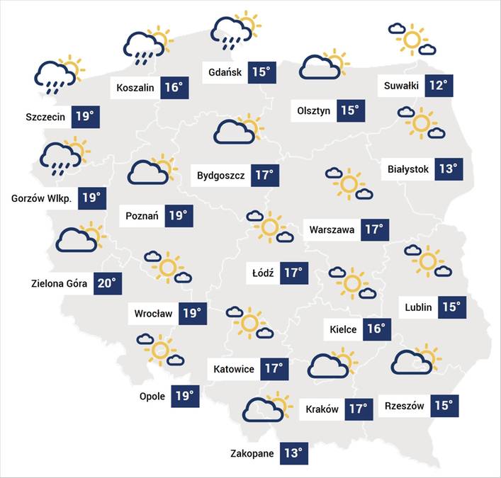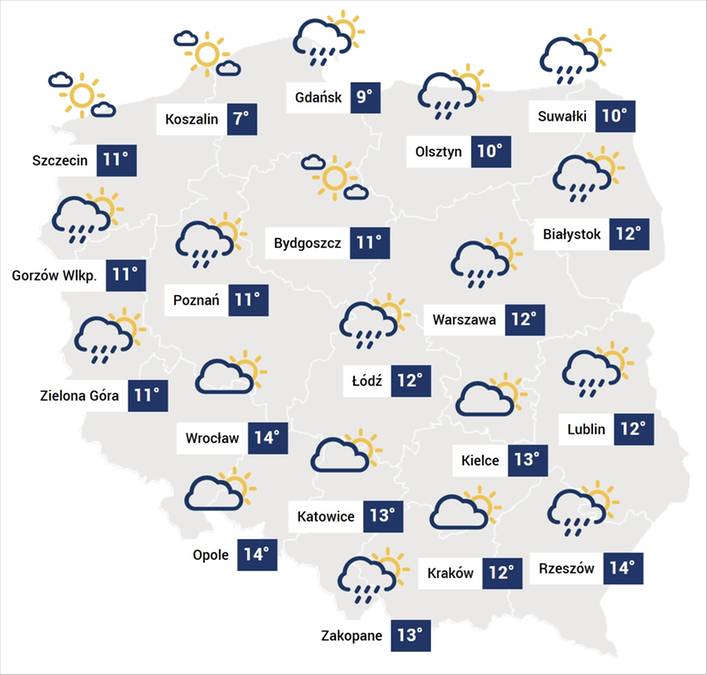 Po południu słońce wyjrzy zza chmur także w centrum i częściowo na zachodzie i północy. Najdłużej padać będzie na południu i wschodzie, niemal do zmierzchu. Dopiero wieczorem wszędzie niebo się rozpogodzi, a opady ustaną.