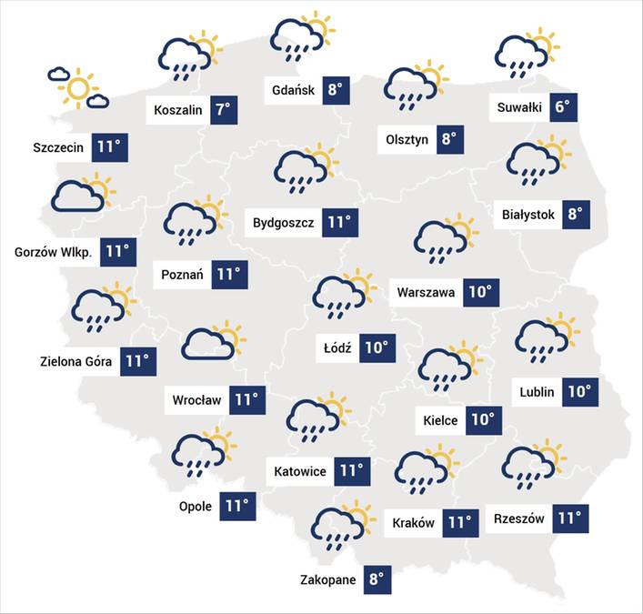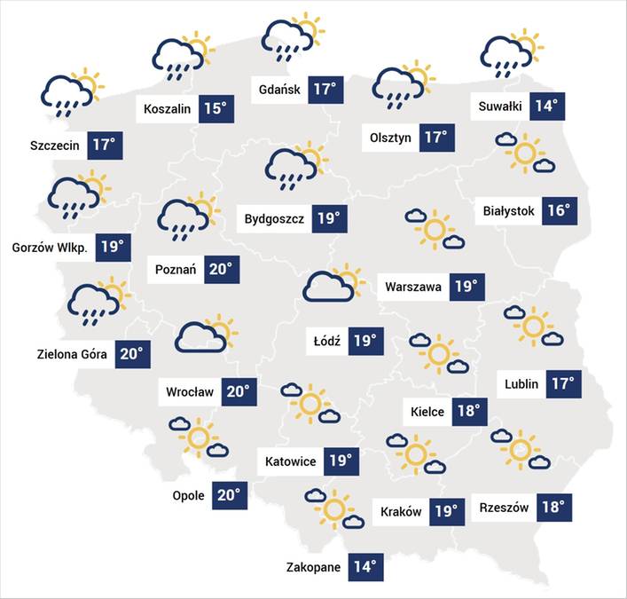Pierwsze oznaki zmian w pogodzie są widoczne w województwach zachodnich i północnych, gdzie z każdą godziną przybywa chmur, a od godzin popołudniowych zaczną przechodzić deszcze, chwilami ulewne, miejscami połączone ze słabymi burzami i porywami wiatru do 60-70 km/h.