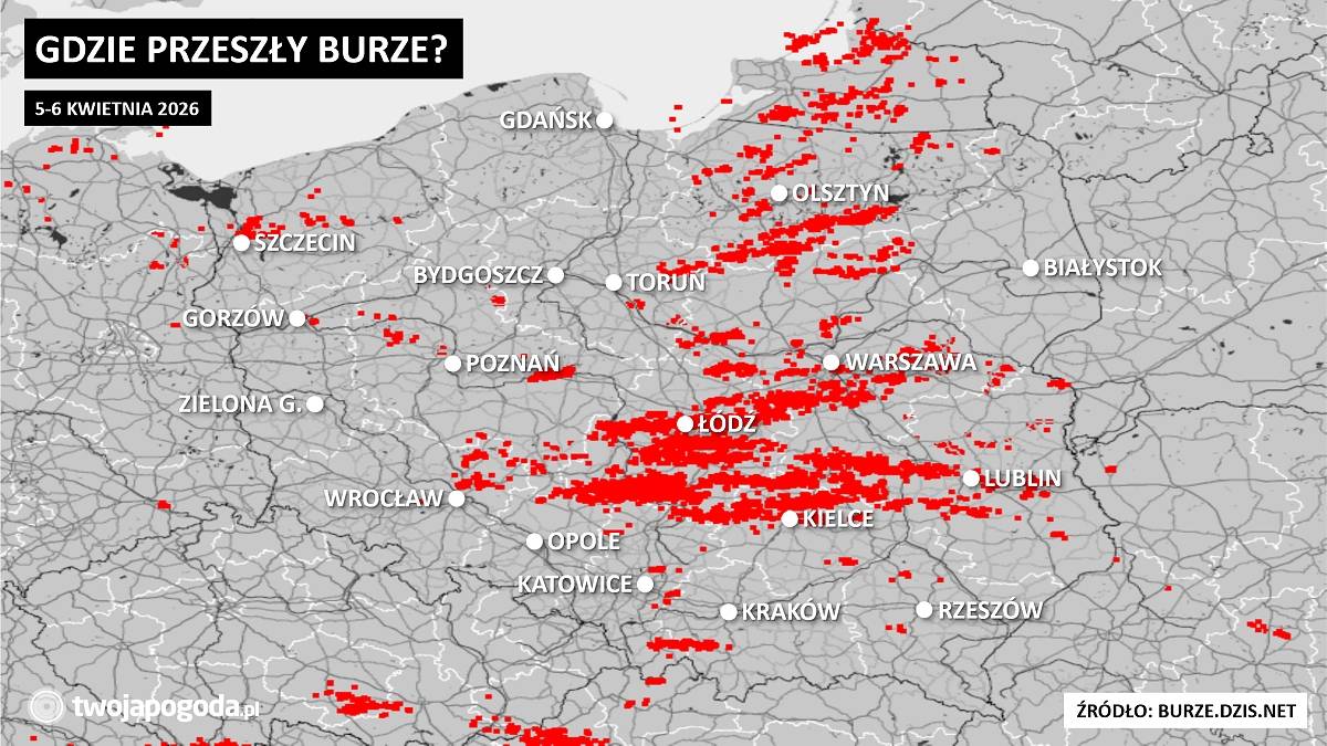 Wczoraj (5.04) z zachodu na wschód kraju wędrował chłodny front atmosferyczny, który poprzedzała linia zbieżności wiatru, wzdłuż której wypiętrzyły się okazałe chmury konwekcyjne. Przynosiły one nie tylko ulewny deszcz i porywisty wiatr, ale też burze, i to nie byle jakie.