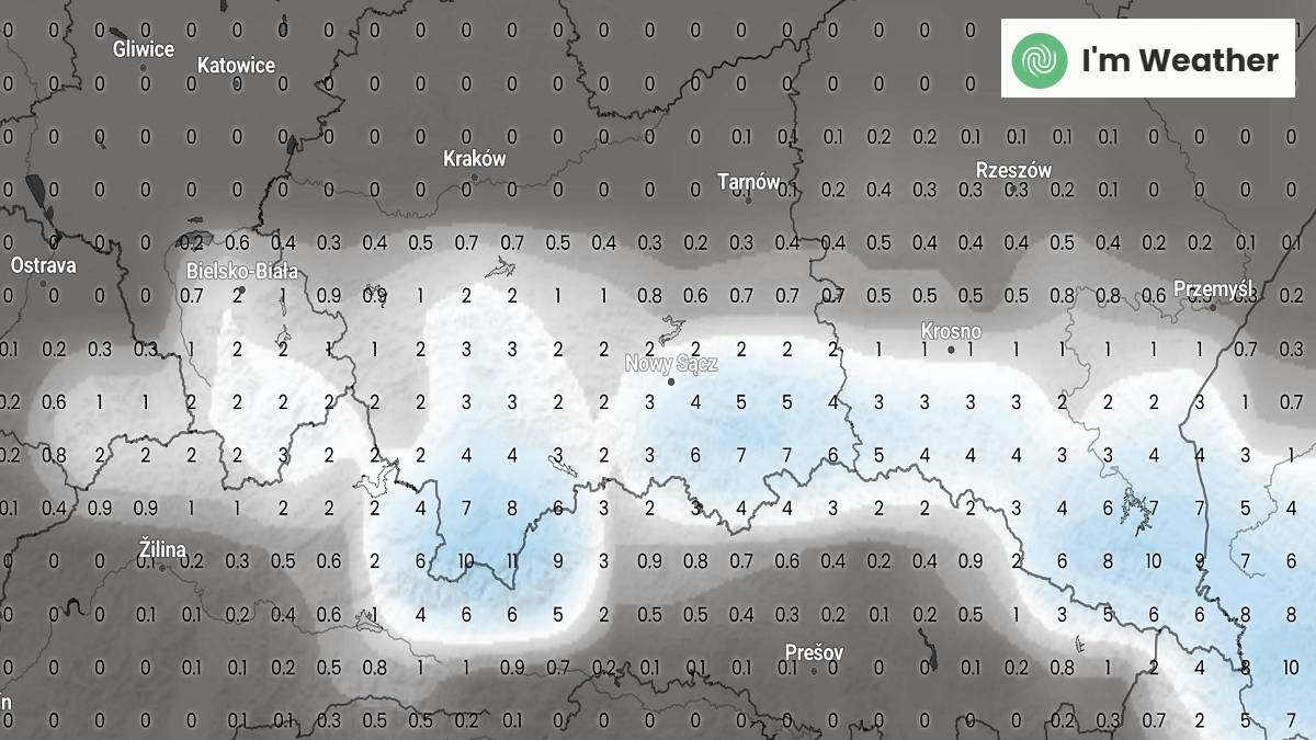 Tyle śniegu może spaść na południu kraju. Fot. imweather.comNajwiększe ilości świeżego puchu spodziewane są w Beskidzie Wysokim oraz w Tatrach. Mogą one spowodować ponowne pogorszenie się sytuacji lawinowej. Przypominamy, że w Tatrach obowiązuje trzeci stopień zagrożenia, a w rejonie Babiej Góry drugi stopień.